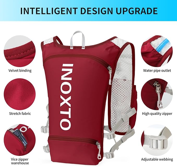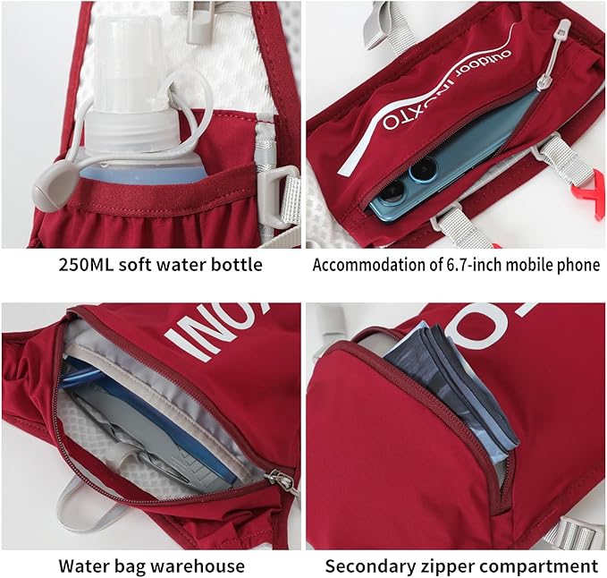 - ❤ 【Ultra-lightweight design】 High-quality nylon material and ultra-lightweight design make it more comfortable to drive. The INOXTO Sport Backpack weighs only 140 grams and can hold 1.6 liters in the main compartment. In addition, the left and right belts have pockets for storing 250 ml PET bottles. Next to the main pocket, there is a pocket for storing mobile phones and items, so you can jog while listening to music!