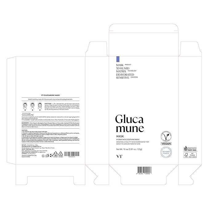 VT COSMETICS Glucamune Mask, Hydrating Vegan Sheet Mask for Face, Hypoallergenic, Fragrance-Free, for Dry & Sensitive Skin, Beta-Glucan, Glucosamine, Glass Skin Glow, Korean Skincare (10 pcs)