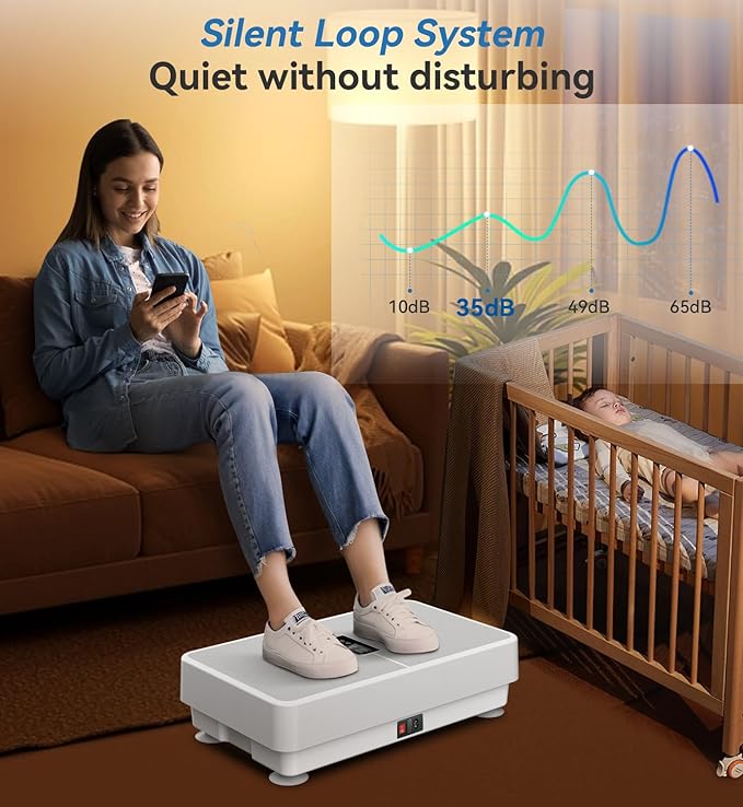 - [Low Noise & Safe Design for Stress-Free Workouts] With low-noise technology, this vibration plate allows you to exercise without disturbing your family or roommates, making it ideal for early mornings or late-night sessions. Non-slip footpads and an emergency stop button add to the safety and stability of your workout