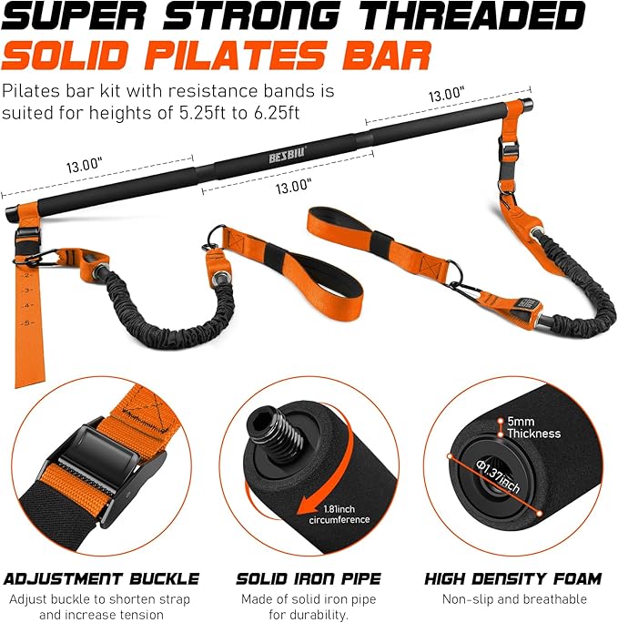 - ADVANCED THREADED PILATES BAR: Composed of 3 sections Φ1.37-inch solid steel rods, with 5mm Soft Nitrile Rubber pad (wear-resistant, sweat-absorbent, non-slip), and can perform stable and safe exercises even if sweat during exercise. Squat bar ends are equipped with adjustable straps with a heavy metal buckle cam that allows you to quickly and easily adjust the length required for various exercises and individual heights. This strong screwed solid squat bar can withstand 600lbs of resistance