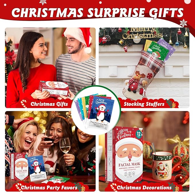 - Ideal for Stocking Stuffers:These Christmas face masks skincare are excellent stocking stuffers,whether it's stuffing them into Christmas stockings or giving them to friends,family or women,they are all ideal Christmas gifts.Sharing these facial mask with friends will leave them a good memory
