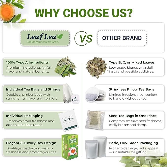 - 100% Natural Guava Leaf Tea – Crafted from pure, carefully selected guava leaves, our LeafLea Guava Leaf Tea Bags provide a natural, wholesome tea experience. These guava leaf tea bags are free from artificial additives, caffeine, sugar, and gluten, making them an ideal choice for those seeking natural wellness and health benefits.