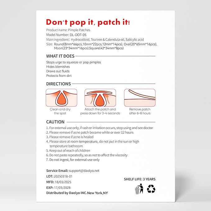 - Easy to Use: Clean and dry the affected area, then peel off and apply the pimple patch. Wait for 6-8 hours before removing. If you're not satisfied with our product, feel free to contact us anytime. We offer 24h service