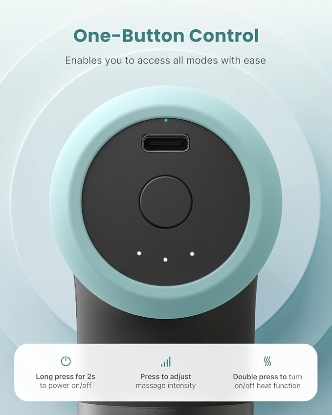 - Effective Heated Massage: Equipped with heat-conductive steel head, the deep tissue massage gun warms up to 46℃/114°F in just 1 minute, effectively reducing muscle tension.Note:Double press the Power button to enable the heating function. The light is red when the heating function is activated. Do not use the silicone massage head when using the heating function.