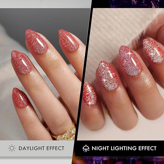 Glitter Red Press on Nails Almond with Sparkling Diamond - Soft Gel Fake Nails Short with Glue, Glossy Glue On Nails for Women Gift in 16 Sizes - 32 Reusable Nails, Starlight Red Orange
