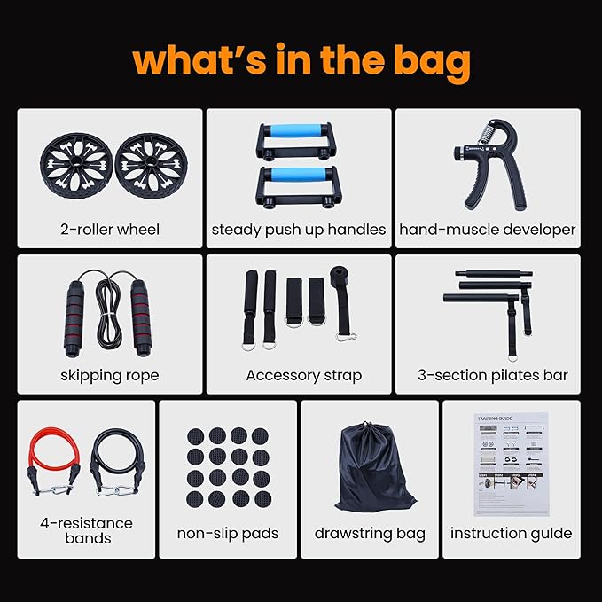 Push-up board, home gym, portable fitness equipment, Pilates bar, and 20 fitness accessories, including resistance bands and an ab wheel, for full-body workouts at home