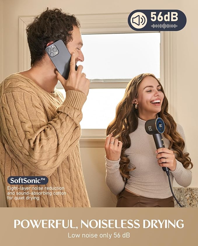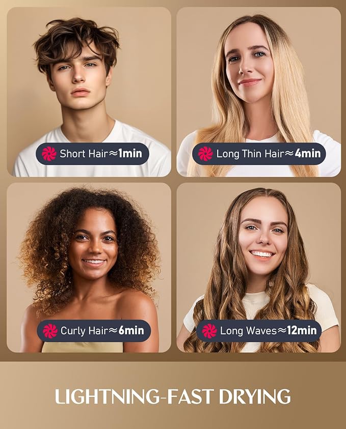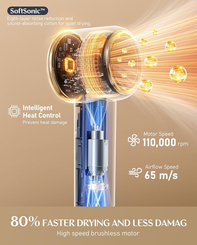 - 80% FASTER DRYING: SonicDry Tech with 110,000 RPM brushless motor delivers 65 m/s airflow that dries hair effortlessly