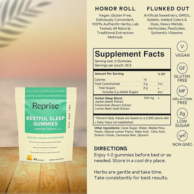 - Quality Natural Ingredients - Made in Taiwan in cGMP facility with strict sourcing and testing criteria. As much as 70% of raw herbs are rejected during the sourcing and testing process. Plant-based, Vegan, Non-GMO, Gluten-free & Gelatin-free: Reprise Restful Sleep Gummies contains deliciously chewable vegan, non-GMO, gluten-free & gelatin-free gummies.