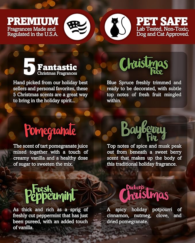 - The perfect festive selection for the holidays featuring 5 of our best selling Christmas scents: Fresh Peppermint, Bayberry Fir, Christmas Tree, Pomegranate, and Dicken's Christmas.