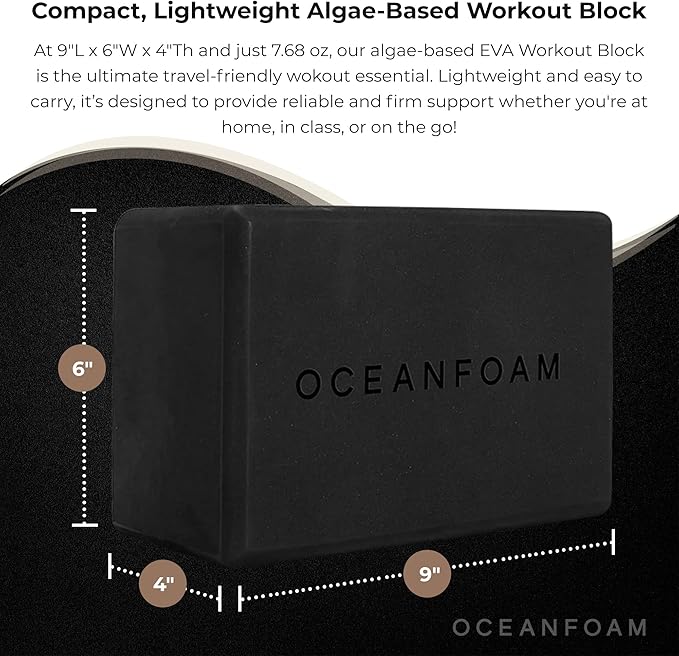 Oceanfoam Workout Block - High-Density Foam Exercise Block, Lightweight, Non-Slip for Stability & Support in Pilates, Yoga, Stretching & More - Algae-based EVA Foam, 9"x6"x4" (Black)