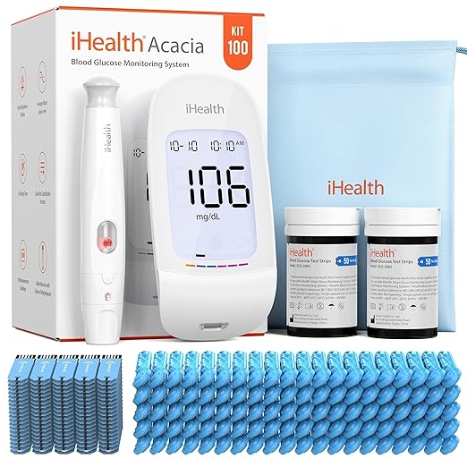 - Complete Starter Kit: The iHealth AG-607 Acacia Blood Glucose Monitoring System kit comes fully equipped with 100 blood glucose test strips, 100 lancets, 1 blood glucose monitor, 1 lancing device, 1 carrying bag, 1 manual, and 1 quick user guide. Additionally, we offer affordably cost-effective refills.