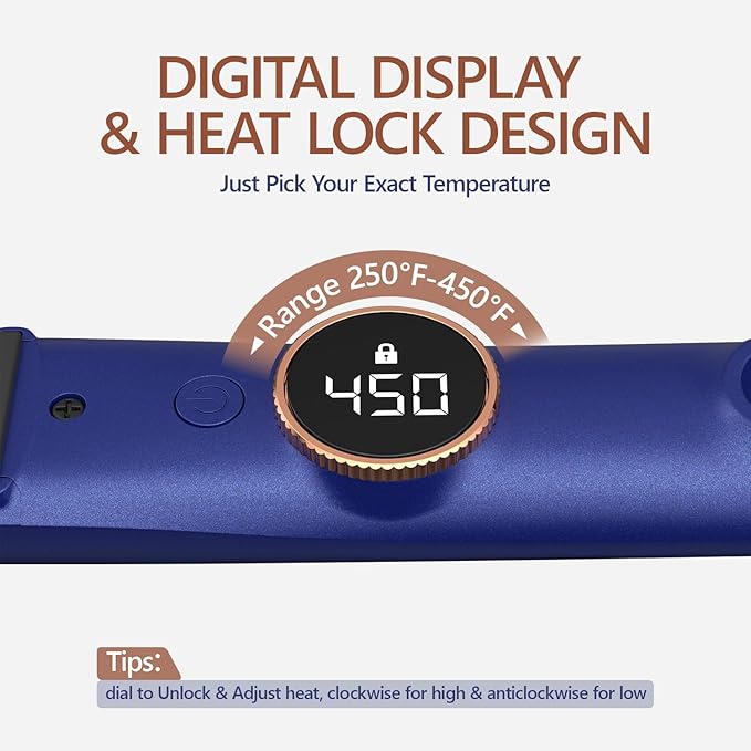 - PRECISION TEMP CONTROL FOR AMAZING RESULTS ON ALL HAIR TYPES – This professional hair iron straightener features a solo digital dial for customized heat settings from 250°F - 450°F with 15°F/20°F increments. Simply dial to choose the exact temperature that suits your specific hair type & texture. Non accidental touch-offs, thanks to its unique auto heat lock design.