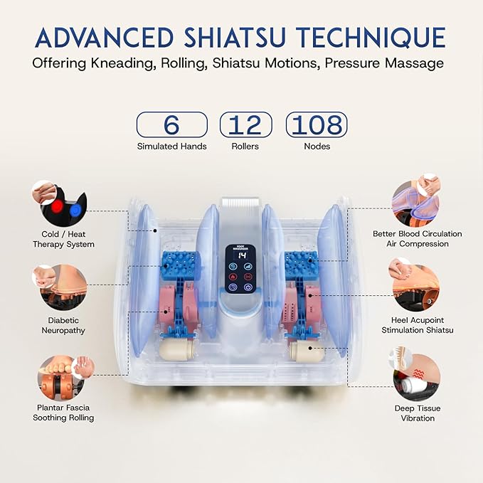 - Professional Foot Massager with Heat:The yoyomax Shiatsu Foot Massager in white offers a luxurious massage experience, simulating professional techniques with 6 synthetic hands, 12 rollers, and 108 nodes. It combines kneading, rolling, and shiatsu motions for a soothing, deep-tissue massage.