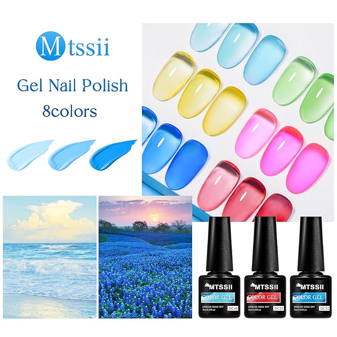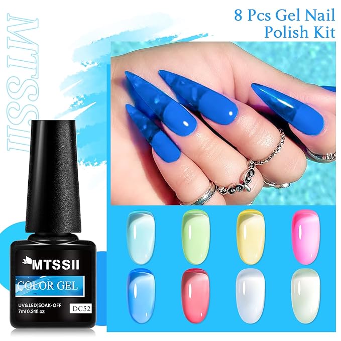 MTSSII Neon Jelly Gel Nail Polish Set 8 Pcs Clear Crytal Glass Gel Polish Yellow Blue Green Red Pink Transparent Sheer Nail Art Varnish Manicure LED UV Curing Required Iridescent Colors