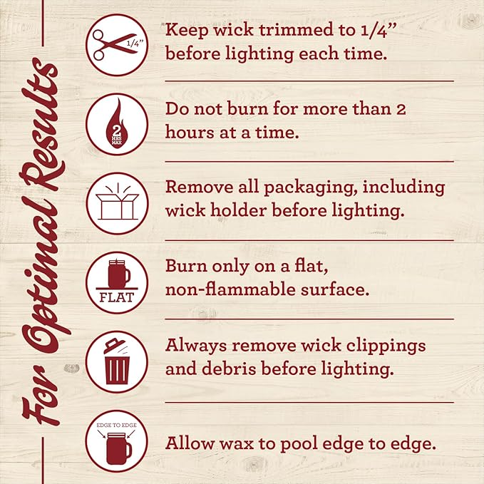 - For Best Results: Keep wick trimmed to 1/4"; for the first burn allow wax to pool edge to edge.