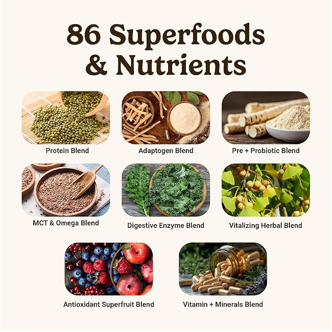 - MORE THAN A MEAL REPLACEMENT – An all-in-one vegan protein powder loaded with omega-3s, MCT, pre + probiotic fiber, adaptogens, digestive enzymes, electrolytes, functional mushrooms, Clinically proven with 300 mg of KSM-66 ashwagandha, and more.