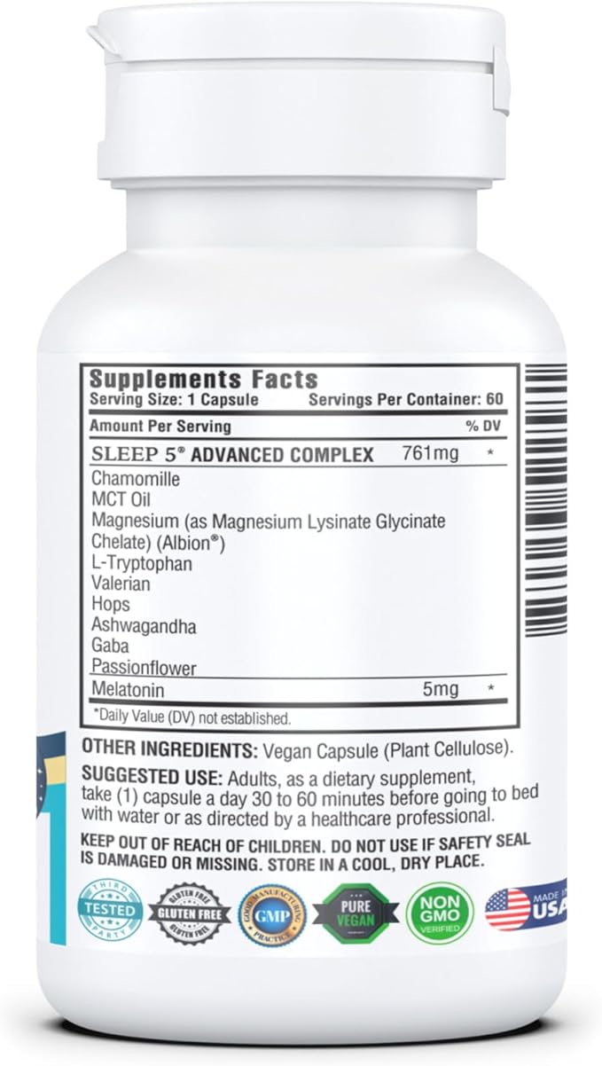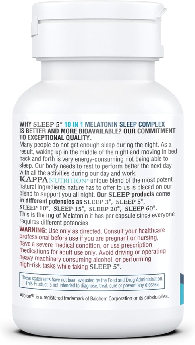 KAPPA NUTRITION Sleep 5, Sleep Aid, 5mg of Melatonin, 60-Day Supply, Non-Habit Forming Vegan Capsules Natural Ingredients for Easier Bedtime, Herbal Supplement, Valerian Root, Chamomile Non-GMO