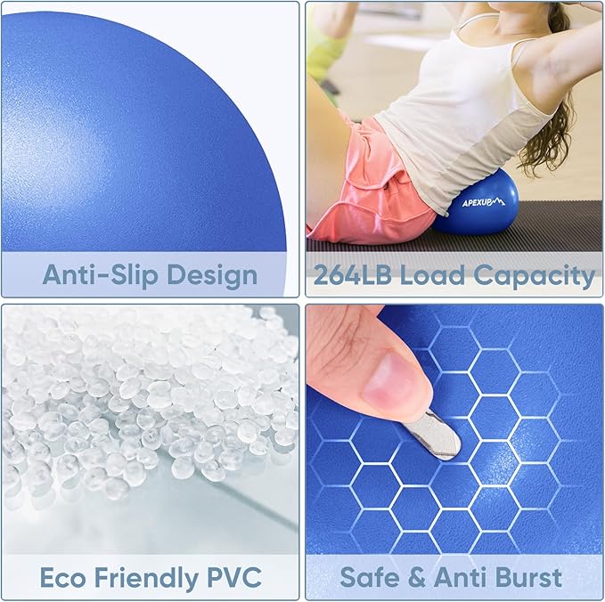 - [ANTI-BURST & ANTI-SLIP] Reinforced with a honeycomb structure for anti-burst protection, this small pilates ball can support up to 550 lbs of weight and will not suddenly burst even when pierced by sharp objects. The fine texture provides non-slip properties, ensuring a safe exercise experience