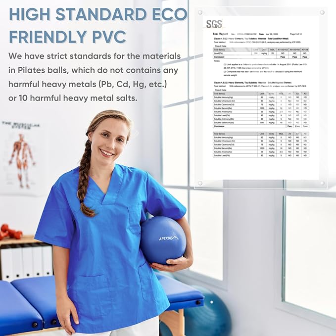 - [SAFE MATERIAL] The 9 inch workout ball is crafted from high-quality, eco-friendly PVC material, these exercise balls physical therapy meet strict standards to ensure safety and durability. They are soft, flexible, and skin-friendly, containing no harmful heavy metals such as Pb, Cd, Hg, etc., or 10 harmful heavy metal salts