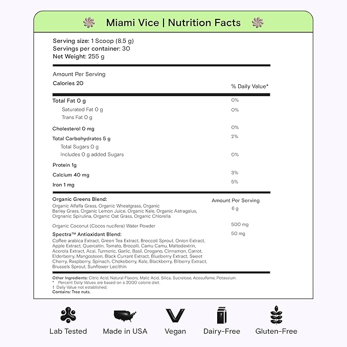 Kiala Nutrition Super Greens, Organic Greens Powder with Spirulina & Chlorella for Digestion, Gut Health, Immunity, Energy, Gluten Free, Vegan, Sugar Free, Spectra Blend, Miami Vice Flavor 30 Servings