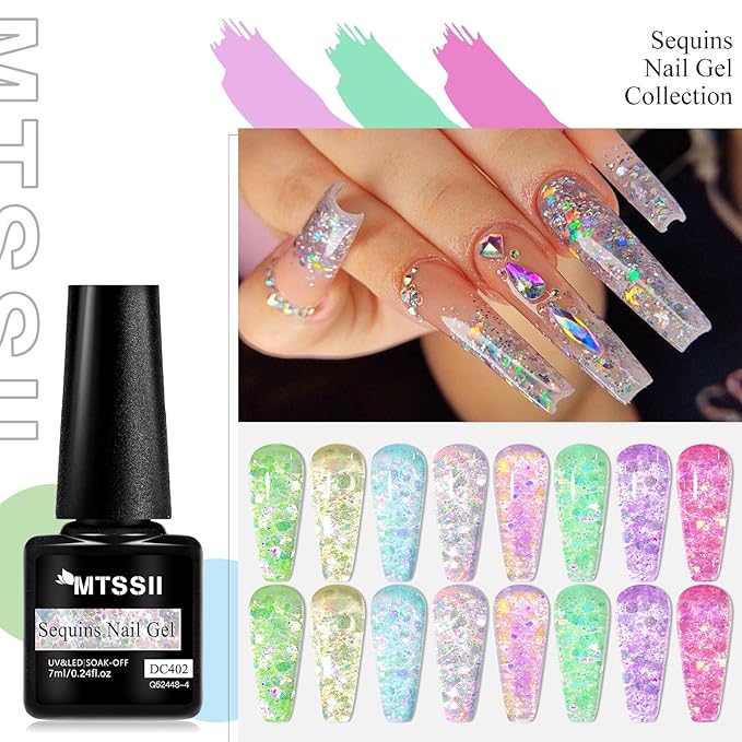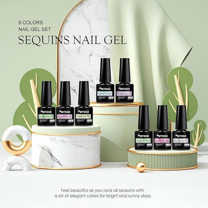 - Package Contents: 8 bottles 7ml jelly glitter gel polish. This super pigmented set with heavy glitter gel is a must have for every nail tech and DIY user! A full set of sparkly glitters to mix and match for any energetic spirit! Get your beauty manicure set on with the shiny nail polish gel.