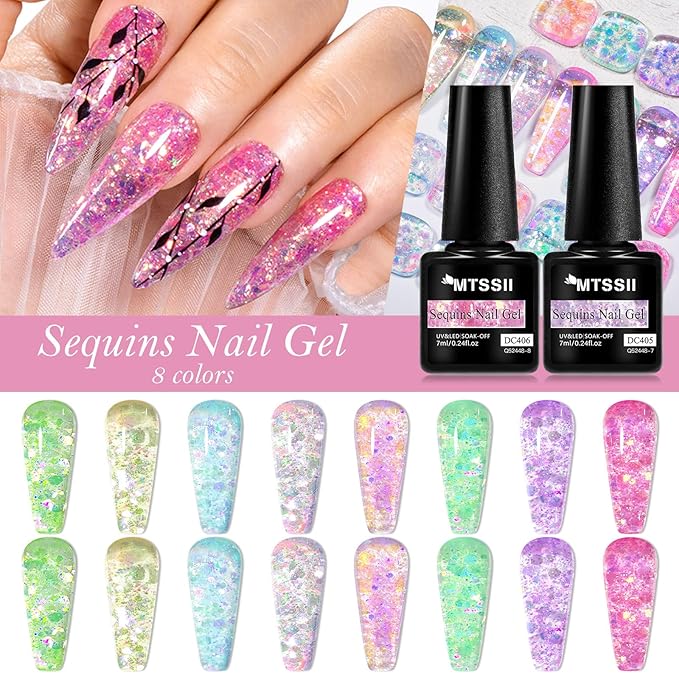 MTSSII Jelly Glitter Gel Nail Polish Set 8 Pcs Transparent Glass Flowinglight Gel Polish Sheer Shiny Sequins Pink Blue Green Purple Gel Nail Kit for Nail Art DIY Manicure at Home