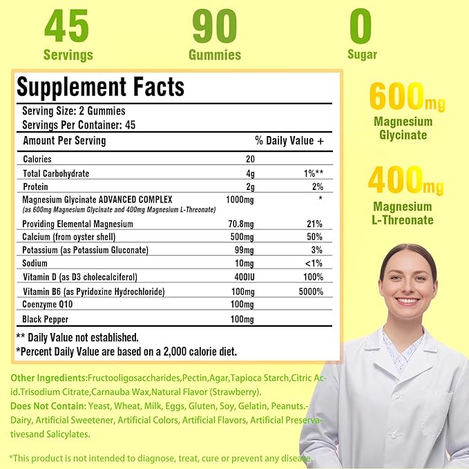 - For Adults: Each serving boasts a blend of 600 mg of Magnesium Glycinate and 400 mg of Magnesium L-threonate, fortified with essential vitamins D and B6, CoQ10 and Potassium, providing a rich, comprehensive nutritional support