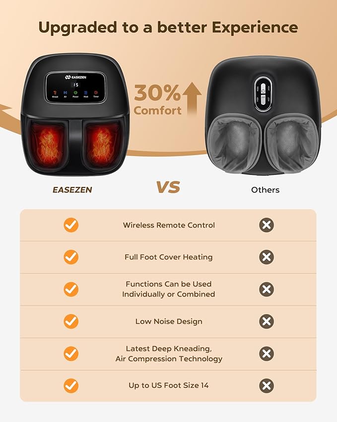 - One Foot Massager for Whole Family: With its enlarged foot rooms, EaseZen【 2025 Upgraded】electric foot massager for plantar fasciitis and can accommodate almost all foot sizes up to men size 14 , the whole family can enjoy a total relax foot massage at home.