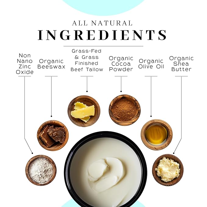 - Skin Loving Ingredients: This zinc sunscreen absorbs quickly and uses nature-inspired ingredients; packed with non-nano minerals, grass-fed/finished beef tallow, olive oil, beeswax, shea butter, and cocoa powder, it nourishes while caring for your skin.