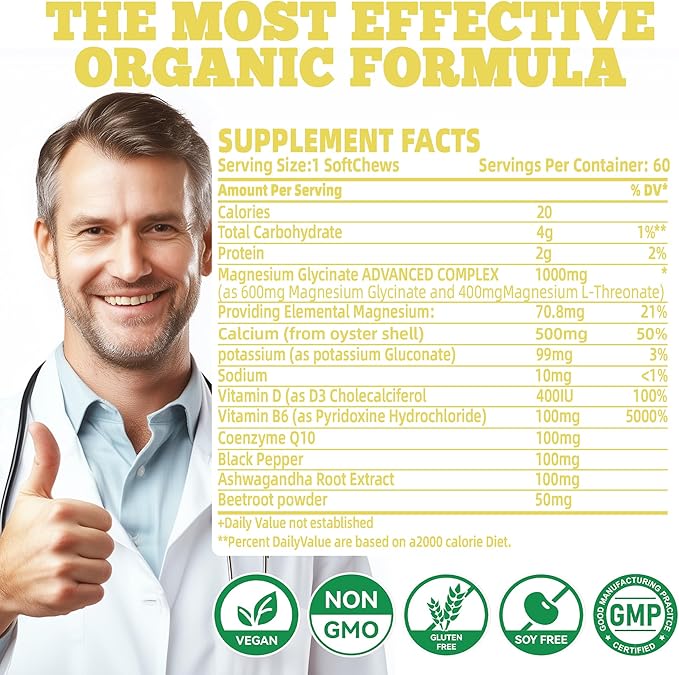 - Powerful House - Our Magnesium Chews Contain Magnesium Glycinate 2500mg, , Vitamins D, B6, Calcium, Potassium, etc. Added Vitamin B6 help magnesium work better, Coenzyme Q10 and potassium help support the mind system and improve Memory and inattention, Vitamin D promotes the absorption of calcium
