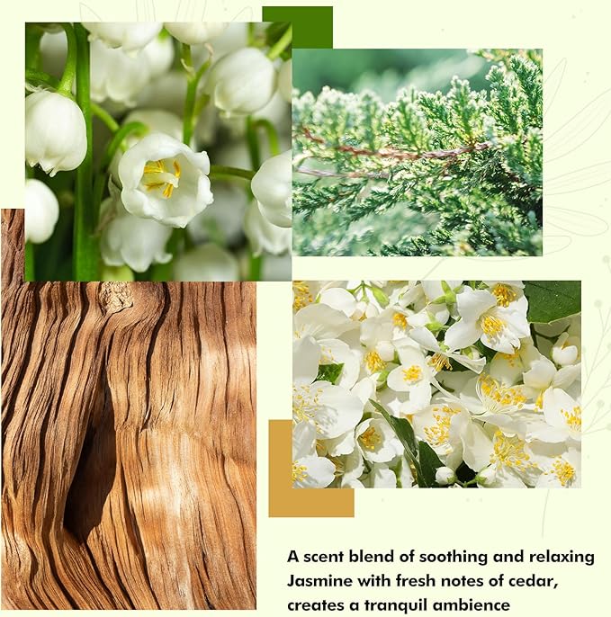 - Aromatic Reed Diffuser: A scent blend of soothing and relaxing Jasmine with fresh notes of cedar, creates a tranquil ambience, helps relieve stress and restore your senses