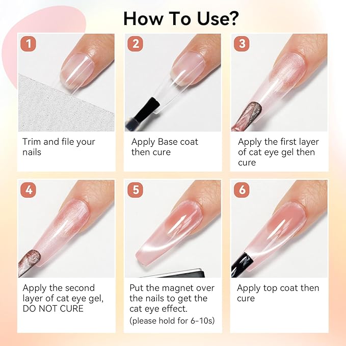 - Warm Tips for Cat Eye Gel for Nails: 1. The Bevimee cat eye nail polish requires UV/LED lamp cured; 2. Base and top coat required; 3. The cat eye effect needs to be done before curing. 4. Applying 2 layers for better coverage