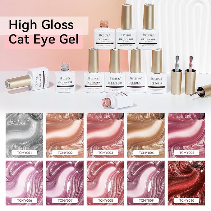 - Fun & Amazing Cat-Eye Effect: Bevimee cats eye gel nail polish with a strong double-headed magnet, you can easily design a variety of gorgeous 9D cat-eye shapes, crystal glass finish, enjoy the nail art from the comfort of your own home