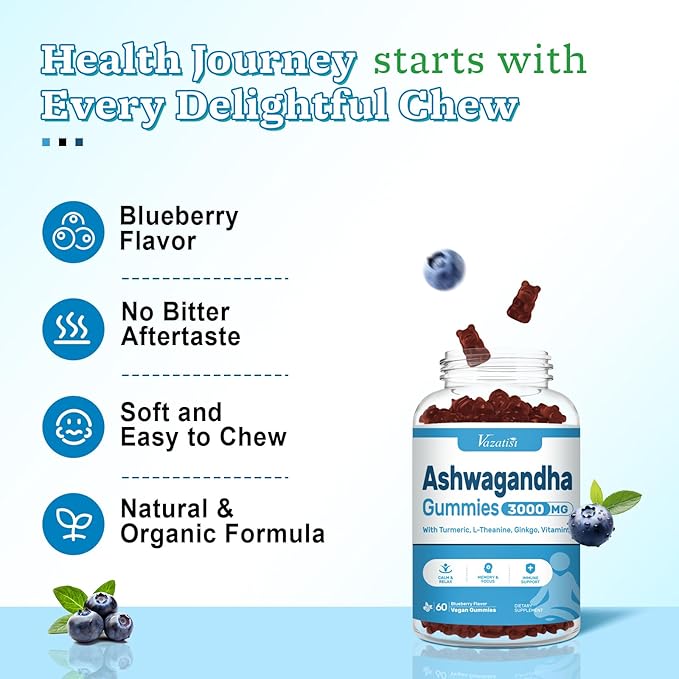 - Yummy Blueberry Flavor: The ashwagandha gummies are easy to digested and absorbed the nutrients by your body. Blueberry flavor making the ashwagandha gummy an enjoyable part of your daily routine of health. Take and Glow on the go