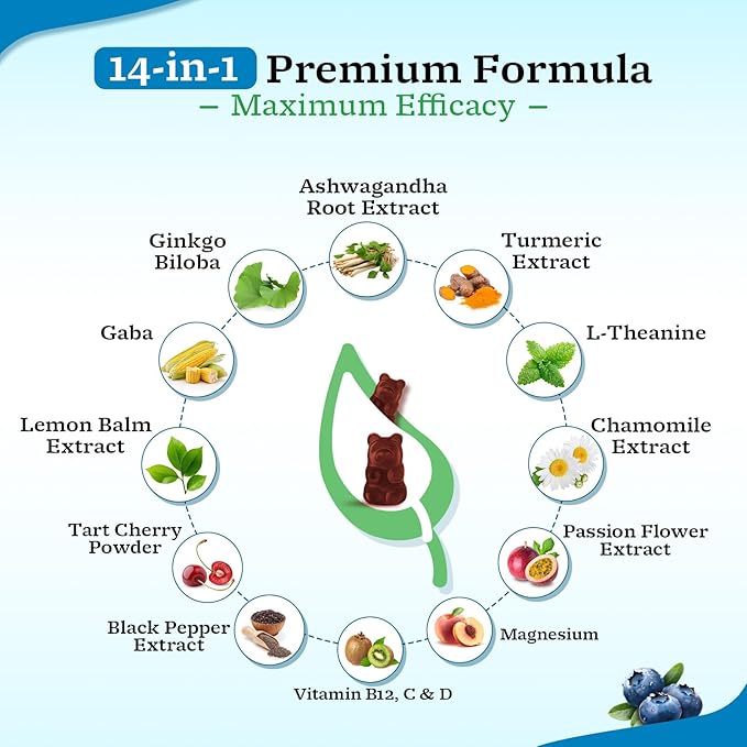 - 14 in 1 The Most Effective Formula: Per serving 2 ashwagandha gummies contain ashwagandha root extract, turmeric, l-theanine, gaba, lemon balm, chamomile, tart cherry powder, passion flower, black pepper, magnesium , vitamin B12, vitamin C and vitamin D