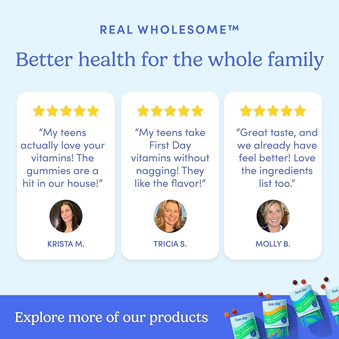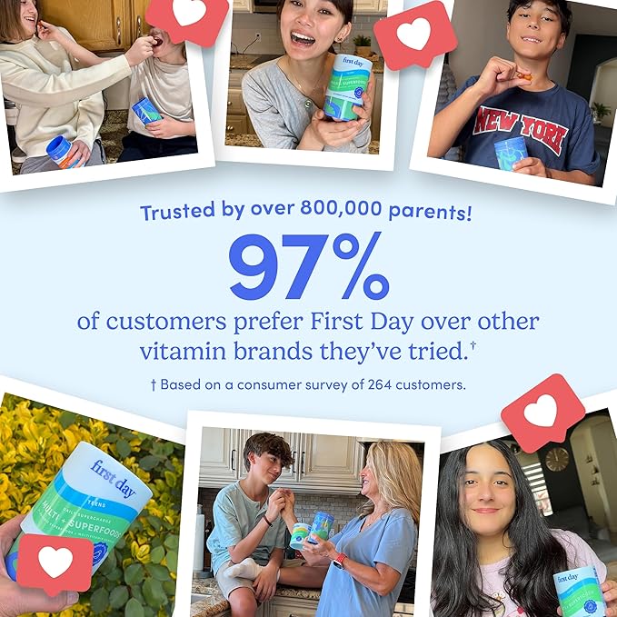 - First Day Convenience: Make wellness a priority with a convenient 30-day supply of teen multivitamin gummies, fitting seamlessly into any busy schedule. Enable your teen to take control of their health independently; with easy, once-daily dosage, they’ll never miss a day of essential nutrients. Trust First Day to provide peace of mind, knowing you are supporting your teen's growth and energetic lifestyle with ease and efficiency.