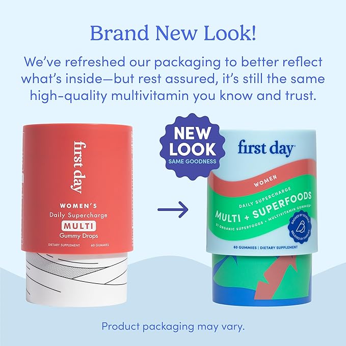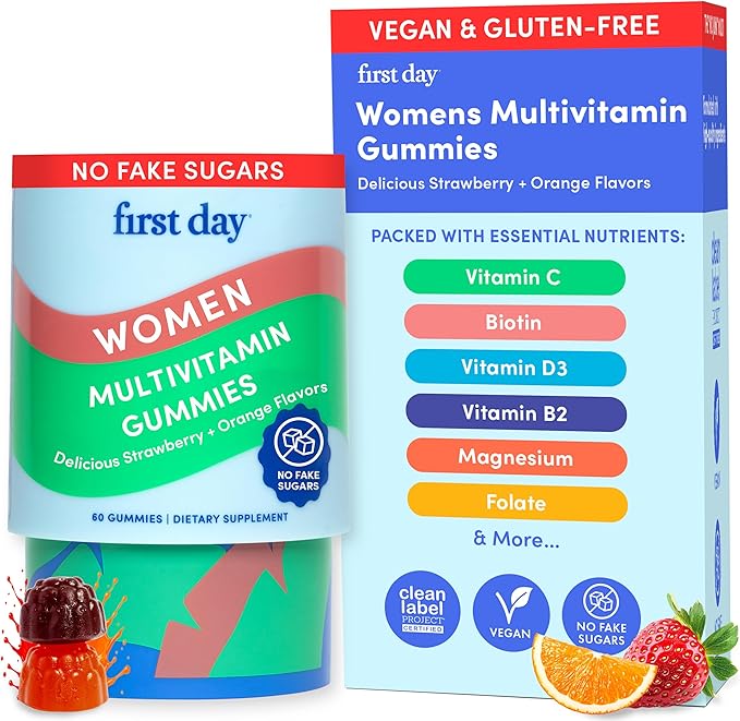 - Empower Your Day with Women's Multivitamin: First Day's gummies are thoughtfully crafted with a blend of organic fruits and vegetables, including apples and blueberries, to support women's health; they fill in the nutrient gaps of modern diets, providing essential vitamins for energy, focus, and growth. Enjoy more folate than 1½ cups of spinach; perfect supplements multivitamins for women seeking vibrant health, clarity of mind, and vitality in every moment.