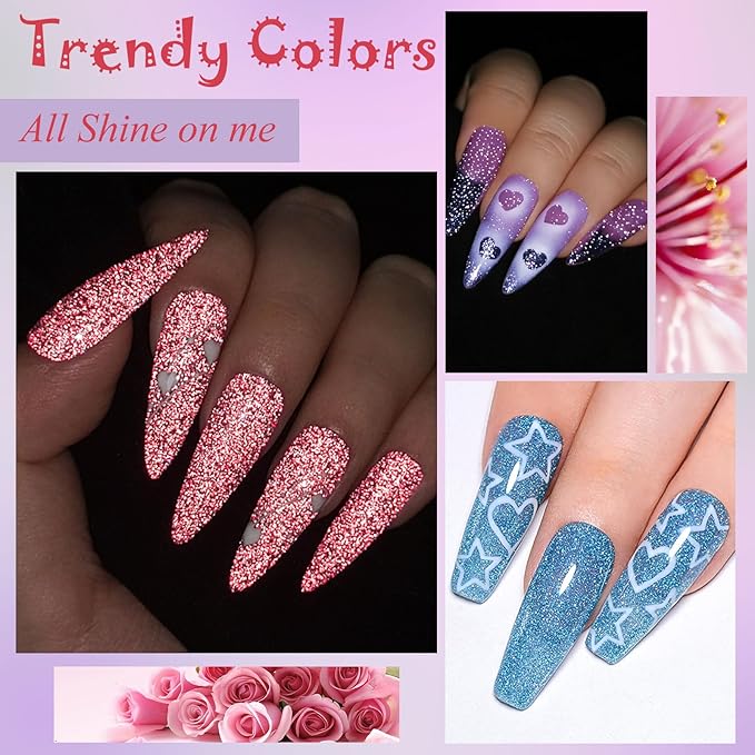 - Reflective Flash Glitter Gel Polish: Our Gel Polish is highly pigmented, delivering a super shiny effect in just two coats. For a gorgeous, shimmery, and sparkly finish, simply apply a top gel. This polish is perfect for daily life as well as various parties and events. This glitter gel nail polish set keeps a little thick because of richer pigmentation so that you can get the perfect sparkling effect.