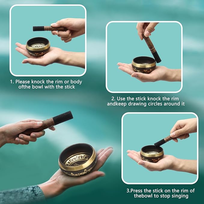 - Ergonomic Design: The 3 inch singing bowl comes with a wooden striker and hand-sewn cushion which flawlessly fits in your hand. The portability of this bowl makes it possible to carry it everywhere you go.