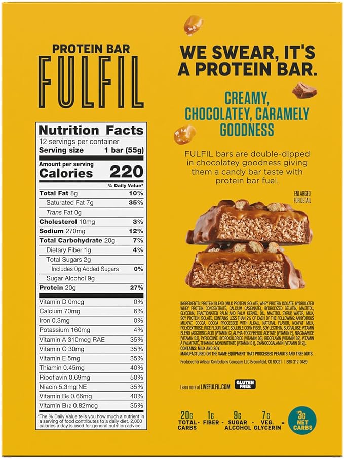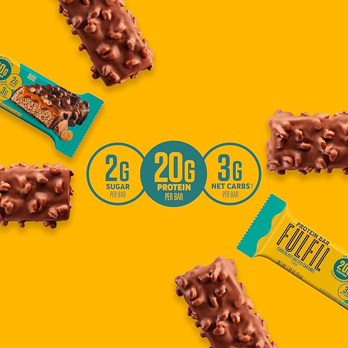 - WE SWEAR, IT'S A PROTEIN BAR: Enjoy a 12 count of our 55g FULFIL Chocolate Salted Caramel Flavored Protein Bars with 20g protein that's so good you'll think it is candy