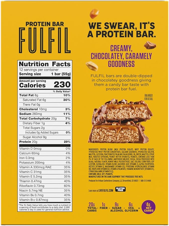 - WE SWEAR, IT'S A PROTEIN BAR: Enjoy a 12 count of our 55g FULFIL Chocolate Peanut Caramel Flavored Protein Bars with 20g protein that's so good you'll think it is candy