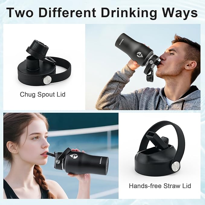 - TWO DIFFERENT DRINKING WAYS: Our stainless steel slim water bottle comes with TWO diffrent BPA-free lids can be switched at any time.The Flex Straw Lid makes it easy to sip while keeping your eyes on the road and your hands on the wheel. The Wide Spout Lid is great for proper hydration whenever you feel like a boost. Excellent sealing lid prevents leakage so that you can just grab and go.