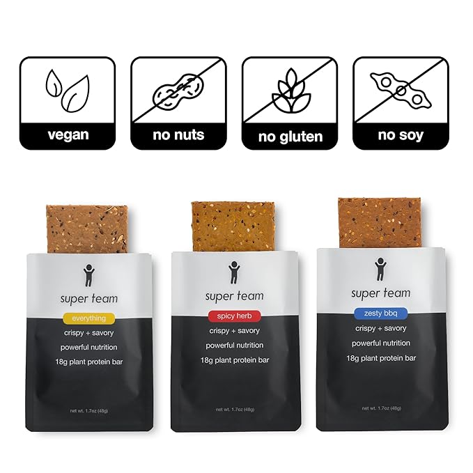Super Team Savory + Crispy Protein Bars - Combo Pack - 12-Count Snack Bars - High Protein (18g), High Fiber (7g), Low Sugar (1g) - Gluten Free, Nut Free, Soy Free, Vegan Plant Based Meal Replacement