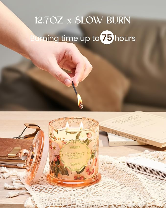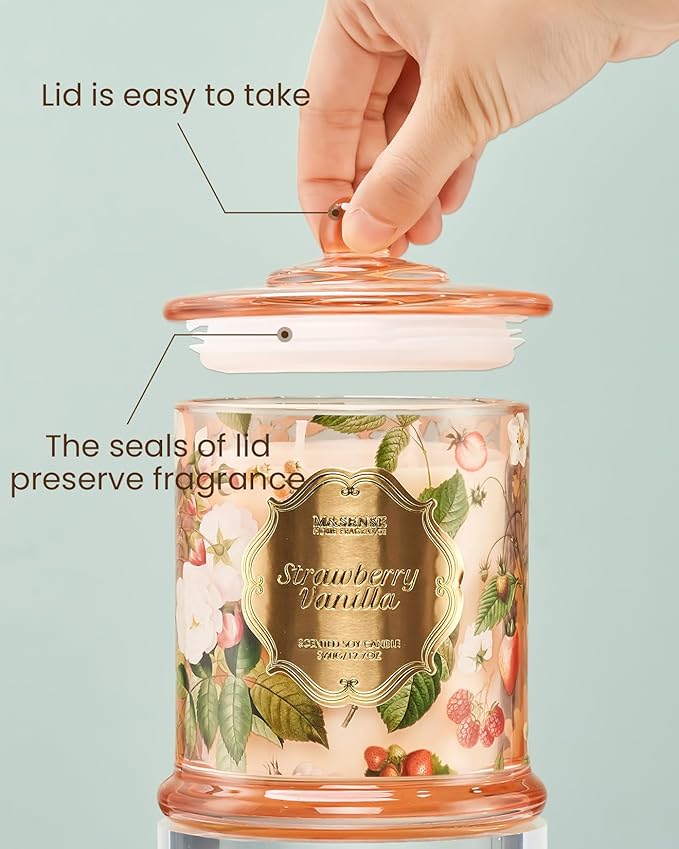 M&SENSE Strawberry Vanilla Scented Candle, Natural Organic Soy Candle 12.7oz 75 Hour Long Lasting Slow Burning, Good Smelling Relaxing Aromatherapy Aaesthetic Gift for Women