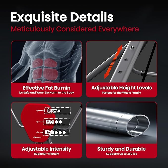 - Stable Triangular Design for Maximum Safety: Worried about tipping over during intense workouts? Our AB SWING features a rock-solid triangular structure, the most stable design for fitness equipment. Additionally, we’ve incorporated a safety stop valve to prevent backward tilting during use. Don’t believe us? Try leaning back 120 degrees—you’ll experience unmatched stability and a perfectly calibrated angle that ensures both safety and workout effectiveness.