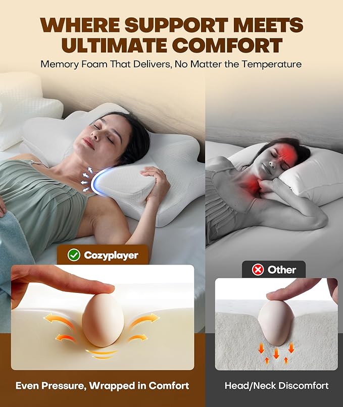 - EXPERIENCE ULTIMATE SLEEP COMFORT WITH THE ALL-NEW CONTOUR DESIGN - Fed up with morning neck pain? Perfect relief awaits! Equipped with the latest patented design, the Cozyplayer Contour Pillow reshapes the contour and hollow zone, promising to revolutionize your sleep. Designed with a hollow contour that skillfully cradles your head, it conforms to your neck’s curve at a 15-degree angle, achieving flawless spinal alignment and significantly lowering body pressure. No more waking up in pain!