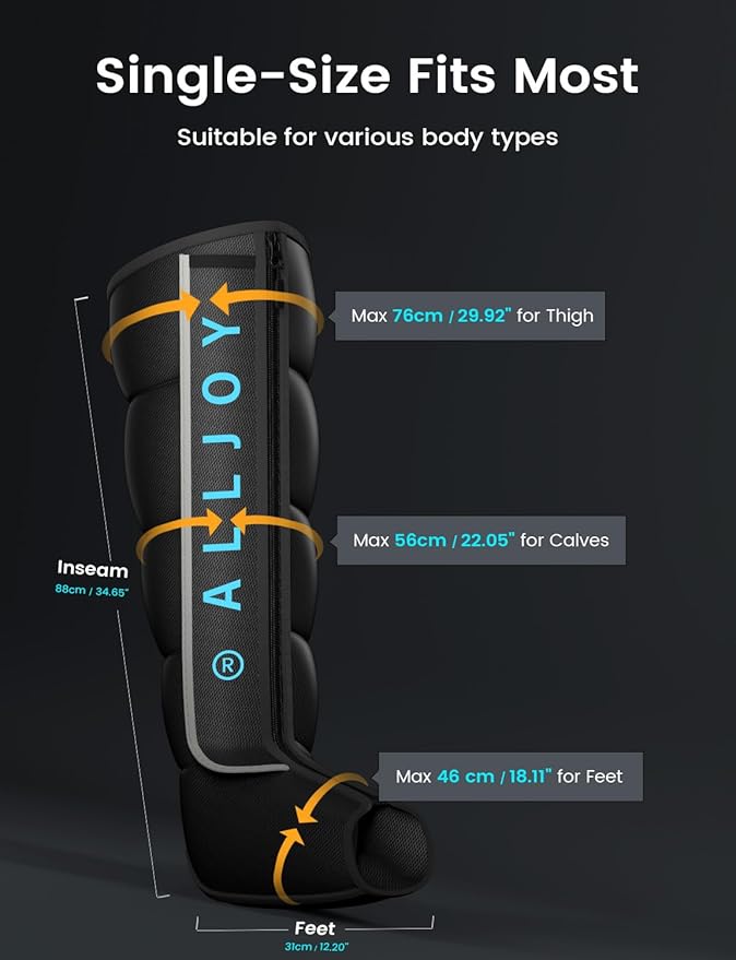 - Advanced 5-Zone Sequential Compression System: ALLJOY's leg recovery system is tailored for athletes and those seeking effective recovery solutions. Equipped with innovative smart pressure sensors and 5 precisely calibrated air chambers, this system delivers rapid inflation and 360° dynamic compression. With 13 customizable programs, you can seamlessly switch between a full-leg massage and targeted zone recovery(feet to thighs) to effectively relieve workout soreness and accelerate muscle recovery.