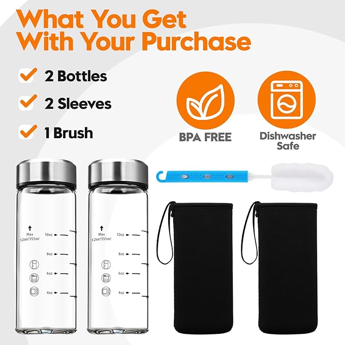 - Wide Mouth: Featuring wide mouths with convenient measurement markings, our glass juice bottles are designed for user-friendliness. The wide-mouth design simplifies cleaning—these bottles are also dishwasher safe. Available in 12oz, 16oz, and 20oz sizes, each bottle is crafted from high-quality borosilicate glass and comes equipped with stainless steel lids that provide a leak-proof seal
