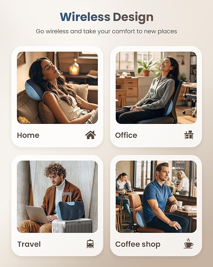 - Cordless Design & 2500mAh Battery:Enjoy true freedom with COMFIER cordless neck and back massager. Built with a 2500mAh high-capacity battery, it delivers long-lasting power for multiple massage sessions on a single charge. Whether you're working late at the office, relaxing on the sofa, or traveling, this wireless massager lets you unwind anytime, anywhere—without being tethered by a cord. Recharge it easily with a standard power adapter or even your phone charger. Relaxation now fits effortlessly into your daily routine, no matter where life takes you.