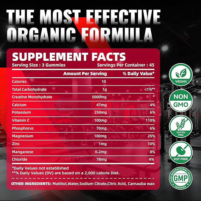 - [Premium Formula,Maximum Efficacy]: Our Creatine monohydrate gummies contains 5g=3 gummies pure creatine monohydrate per serving combined for Maximum Benefits.